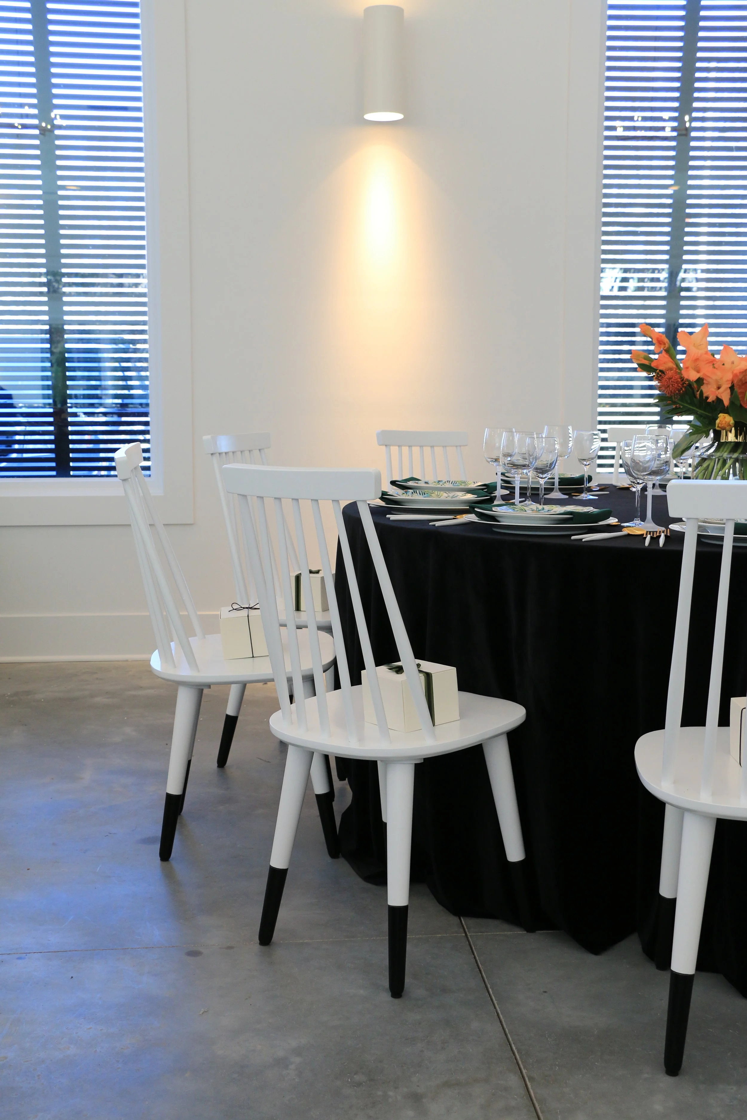 We partnered with Dani Erickson of Studio Fleurette for the tropical floral arrangements. Bold orange and hints of marigold, really brought out the detail in the plates and complimented the bold black and white. This was a perfect look for a transition into Winter from Fall.