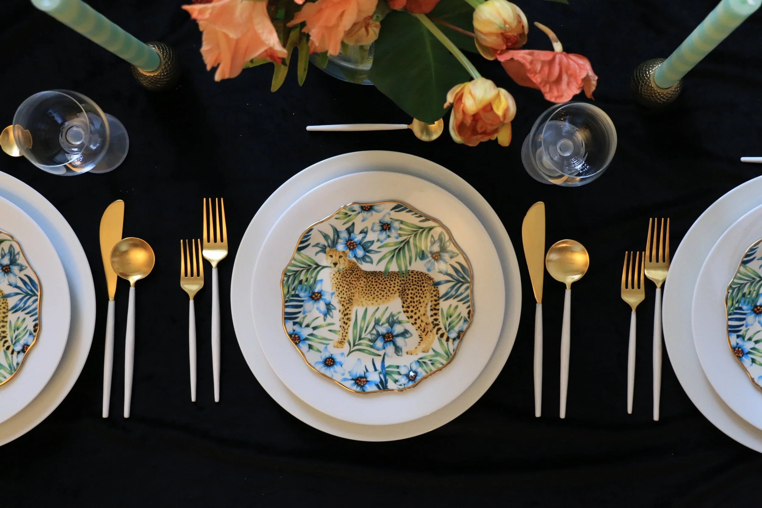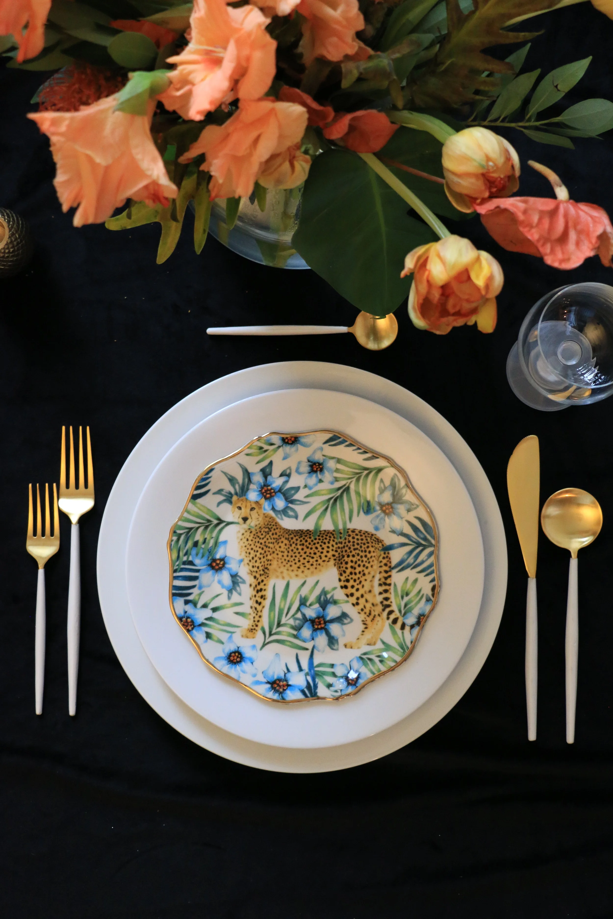 The A&S team styled a concept for a Winter Bash in the new Hutton House venue on Medicine Lake. The style was inspired by a collection of safari printed plates by Artist, Lou Rota. "When I came across these plates I immediately knew these would be the core piece for our winter bolds and marigolds concept," said Creative Director, Anthony Diaz. "I am so excited for the blue and leopard".